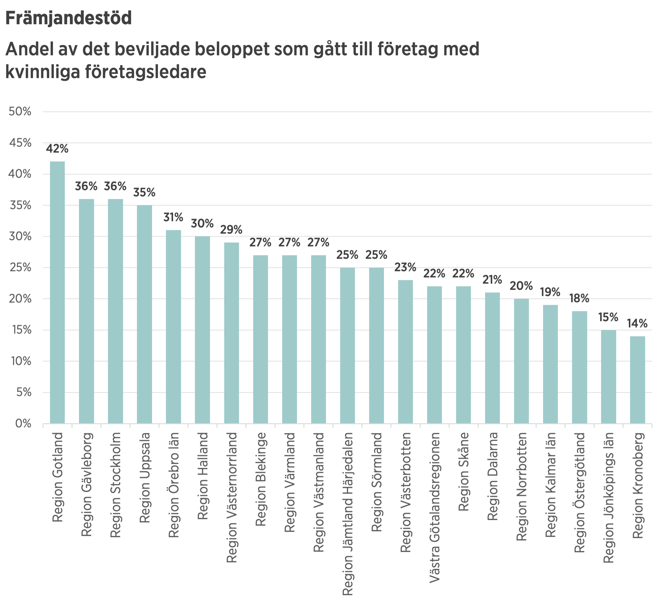 Bifogade diagram visar hur ofta varje region ger stöd till företag med kvinnliga företagsledare.