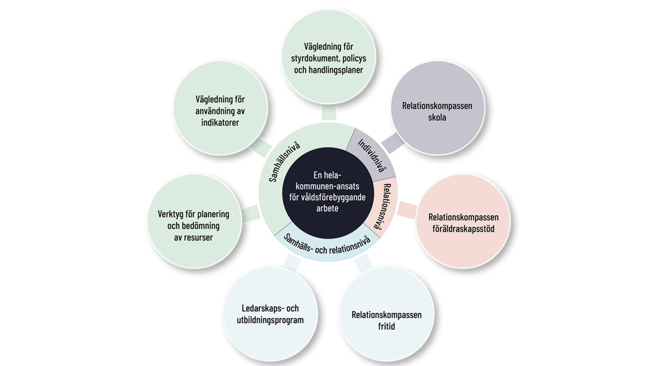Relationskompassen kombinerar skola, fritidsverksamhet samt föräldraskapsstöd och arbetar på alla nivåer i den socioekologiska modellen – från individnivå till samhällsnivå. Genom att diskutera och reflektera över olika teman i utbildningsmaterialen - så som våld, normer, känslor och relationer - får barnen en möjlighet att skapa en stabil grund för schysta nära relationer som bygger på respekt, samtycke och jämställdhet.